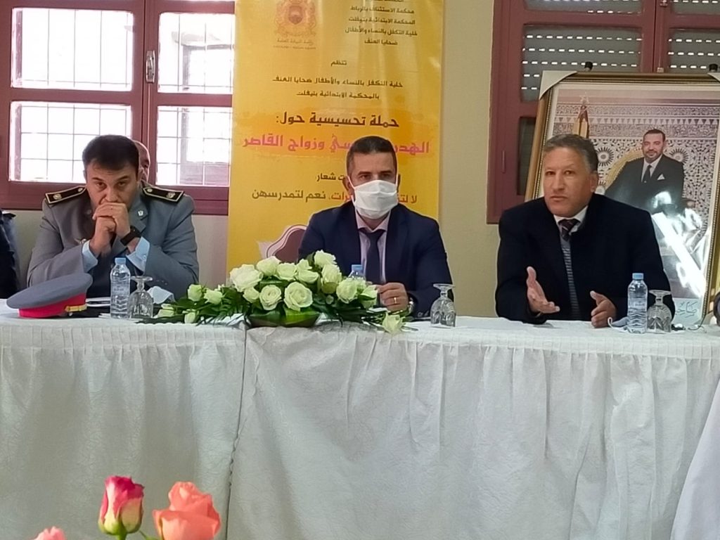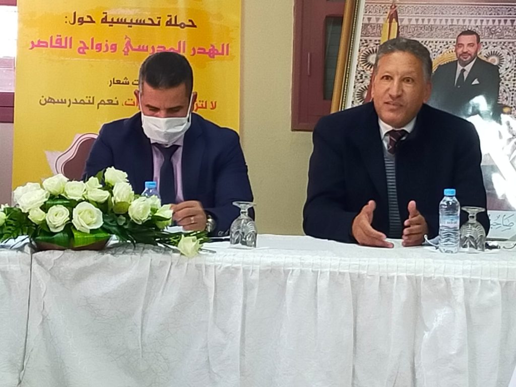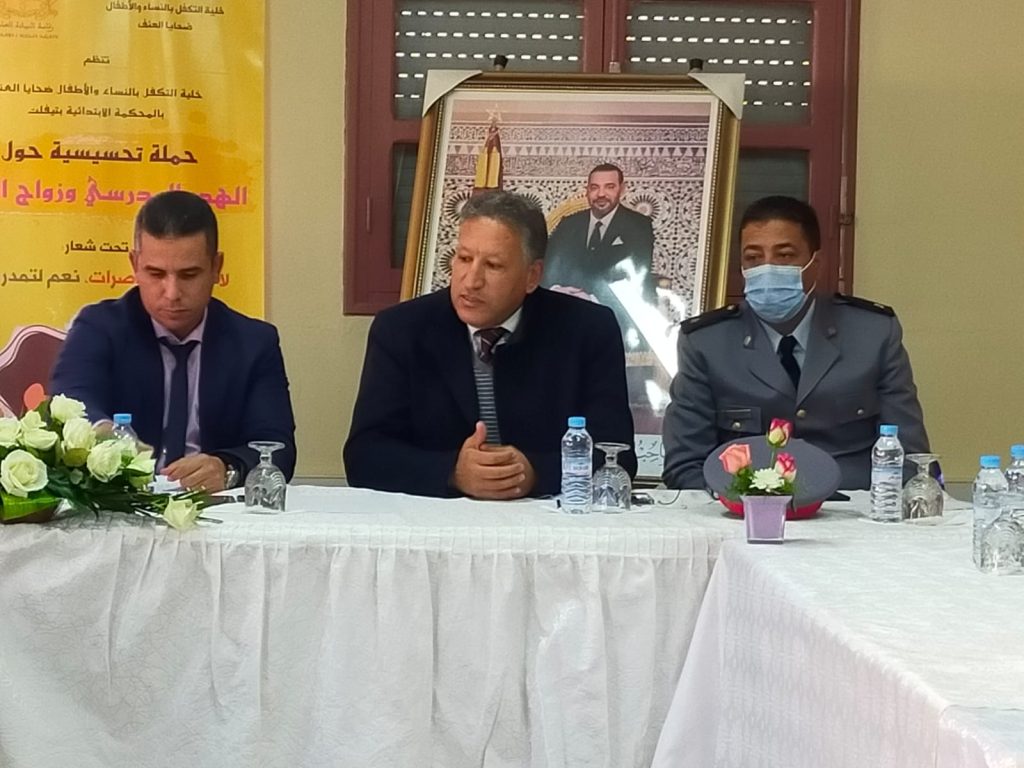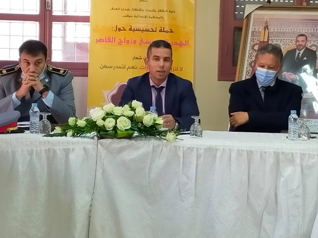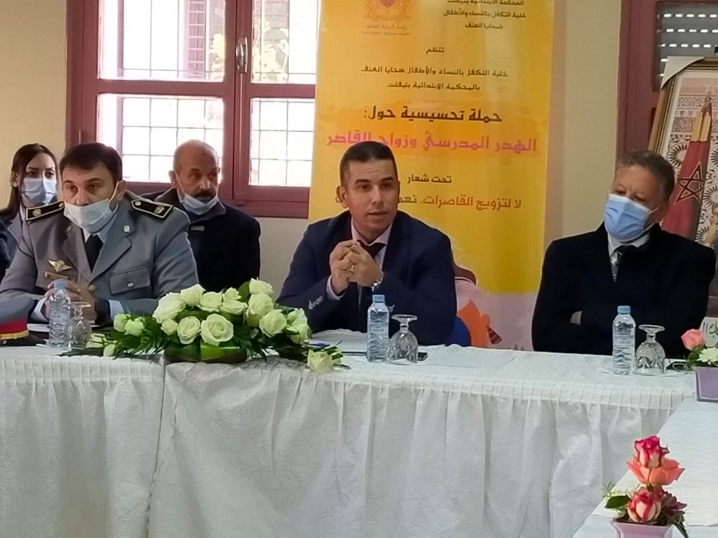 وقد أطر هذه الحملة التحسيسية الأستاذ يونس شلوشي ،نائب وكيل الملك لدى المحكمة الابتدائية بتيفلت في محورين: الأول حول الهدر المدرسي ،الحلول الممكنة،الثاني حول تزويج القاصرات ،الأسباب والحلول.