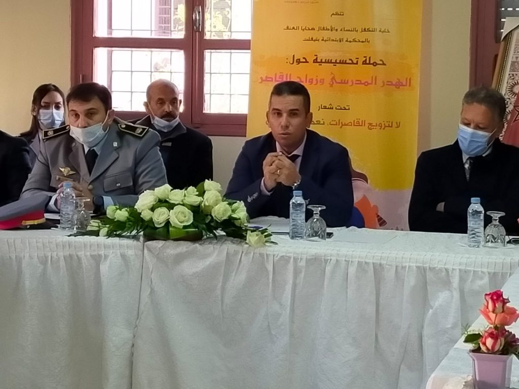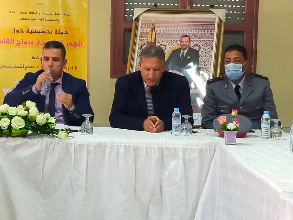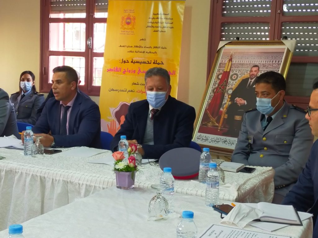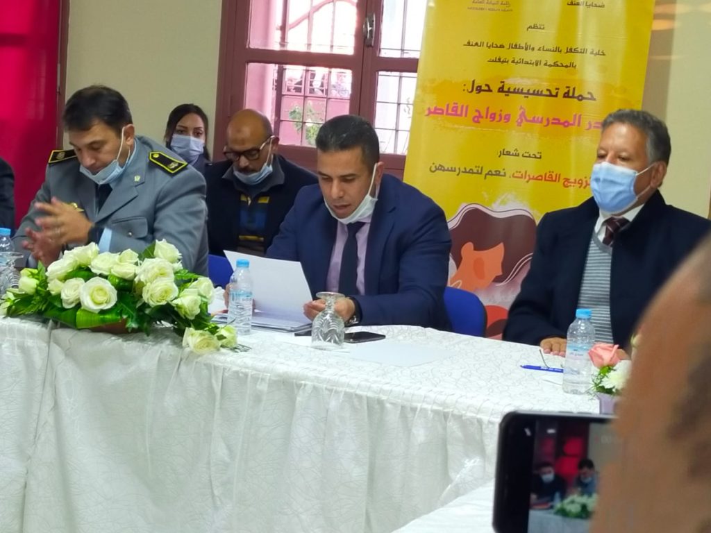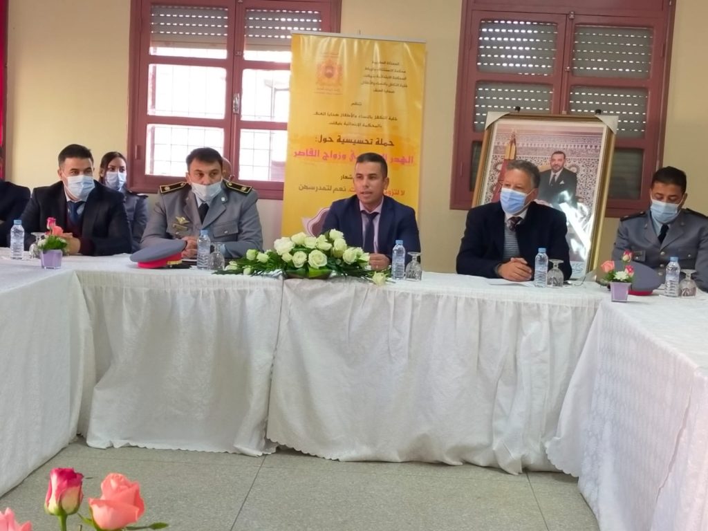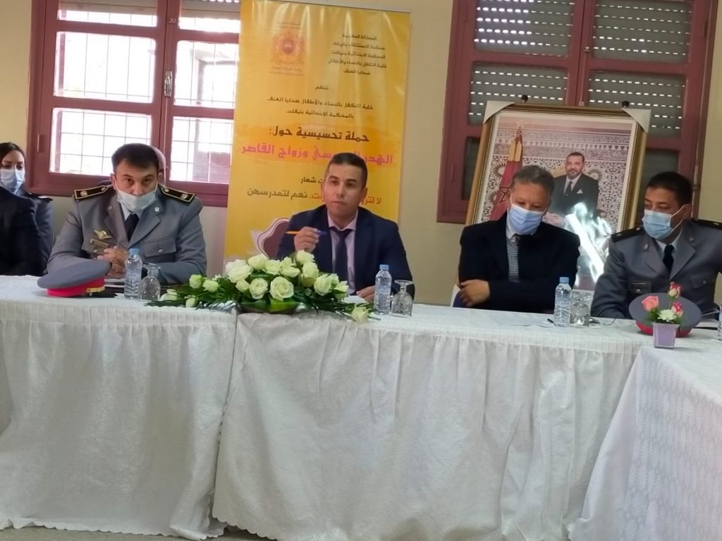 وقد أطر هذه الحملة التحسيسية الأستاذ يونس شلوشي ،نائب وكيل الملك لدى المحكمة الابتدائية بتيفلت في محورين: الأول حول الهدر المدرسي ،الحلول الممكنة،الثاني حول تزويج القاصرات ،الأسباب والحلول.