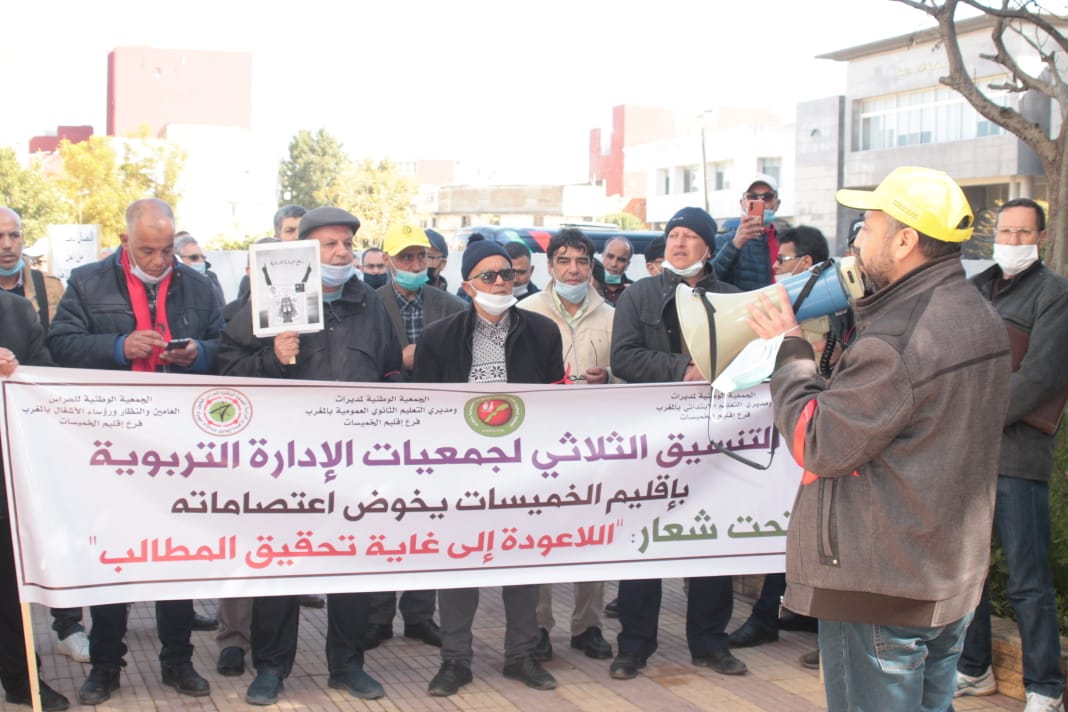 شهدت المديرية الإقليمية لوزارة التربية الوطنية بالخميسات يوم الثلاثاء 2 فبراير2021، اعتصام الأطر الإدارية التربوية التابعين للمديرية تنفيذا لقرارات الجمعيات الوطنية الثلاث المؤطرة للهيئة الإدارة التربوية.وقد سبق للتنسيق الثلاثي والذي يضم الجمعية الوطنية لمديرات ومديري التعليم الإبتدائي، والجمعية الوطنية لمديرات ومديري الثانويات العمومية، والجمعية الوطنية للحراس العامين والنظار ورؤساء الأشغال ومديري الدراسة، سبق أن أصدر بيانا وطنيا في 18 من الشهر الجاري تحت شعار ” اللاعودة إلى غاية تحقيق المطالب “، يدعو فيه الأطر الإدارية إلى الاحتجاج على “ما يعرفه ملف الإدارة التربوية من لبس وغموض جراء تملص الوزارة الوصية من وعودها والتزامها بإخراج المرسومين المتوافق حولهما” – حسب البيان الذي توصلنا بنسخة منه.وقد عرف مقر المديرية الإقليمية اليوم إعتصام حوالي 100 إطار تربوي، من مديرين، ونظار، وحراس عامين، من مختلف المؤسسات التعليمية بإقليم الصويرة،رافعين شعارات داعية الوزارة الوصية والحكومة إلا الاستجابة لمطالب الهيئة ومن أهمها إخراج المرسومين، والإطار الخاص بالإدارة التربوية.