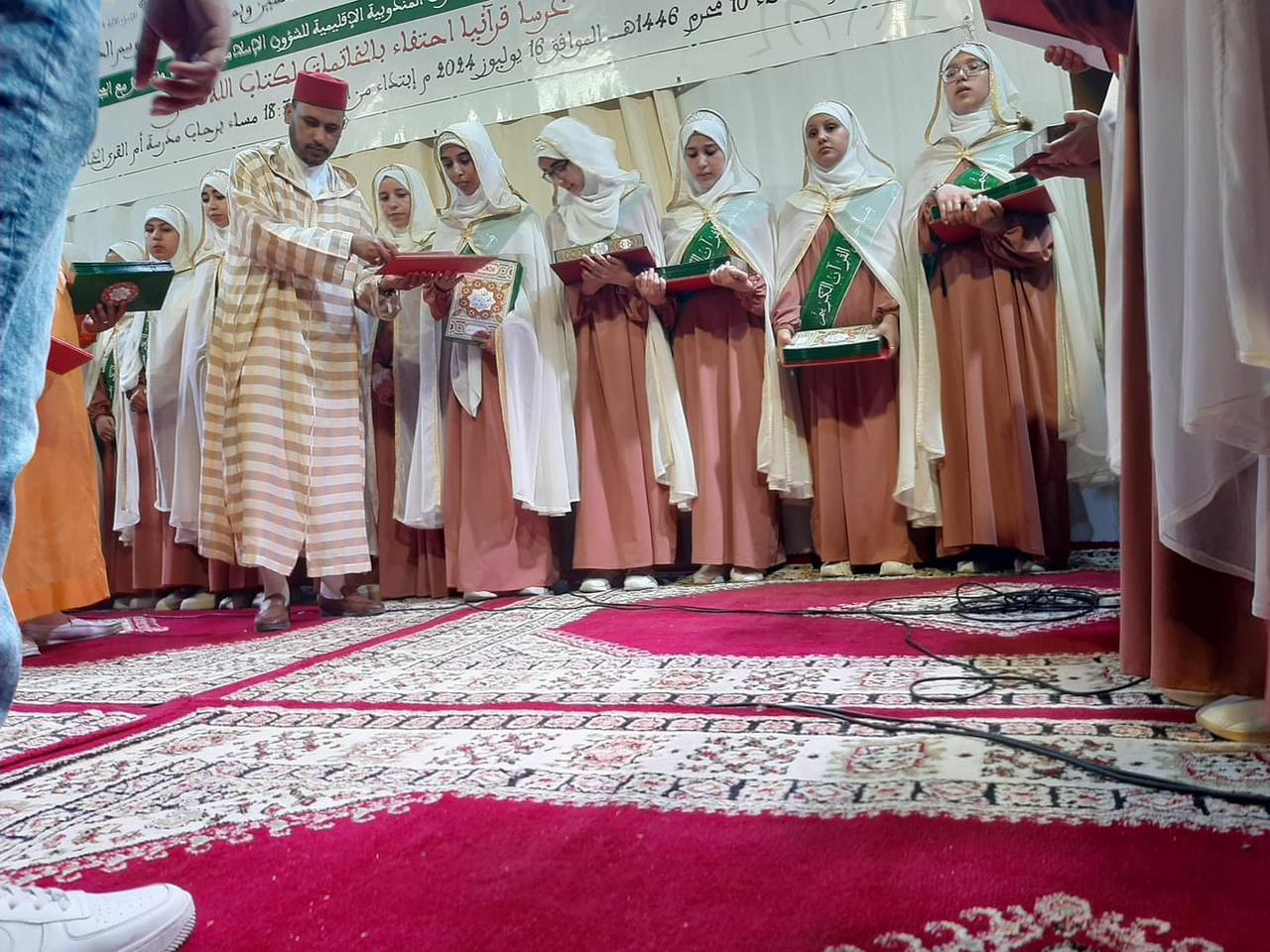 وتخللت هذا الحفل الديني الذي حضره جمهور غفير من الساكنة و اولياء وأمهات التلميذات ، فقرات من قراءة جماعية مرتلة لبعض تلميذات المؤسسة، وأمداح نبوية، ودعاء اسماء الله الحسنى، وعرف ايضاً توزيع بعض الهدايا الرمزية والشواهد التقديرية على التلميذات الخاتمات لكتاب الله تعالى وعلى باقي المتفوقات تشجيعا لهن على حفظ كتاب الله تعالى.