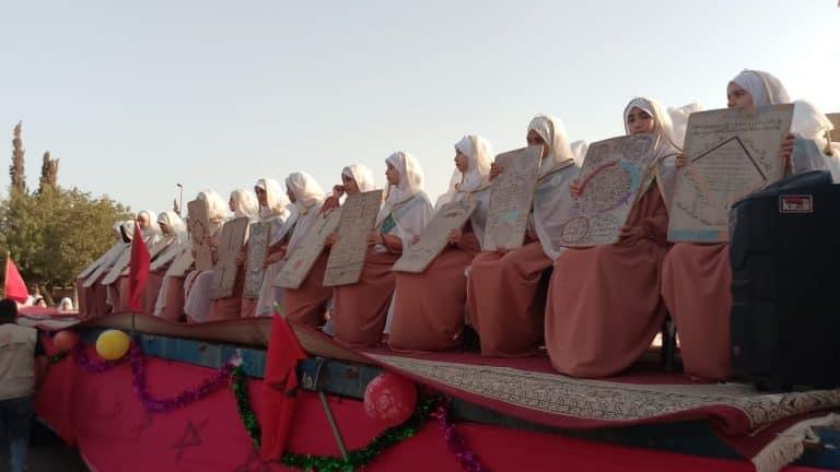 وجابت خاتمات القرآن الكريم قبل انطلاق الحفل من بقرب السوسيو الرياضي بحي النصر على شارع محمد السادس بشيشاوة في قافلة مهيبة بزي موحد ومحتشم حاملات ألواح قرآنية في جو روحاني، وبأداء ملائكي علت أصوات الحافظات والتلميذات اللواتي ينتمين لمؤسسة مدرسة ام القرى، مرددن تراتيل جماعية قرآنية وأمداح نبوية وبالدعاء لأمير المؤمنين بالنصر والتوفيق، وأن يحفظه الله كما حفظ الذكر الحكيم.