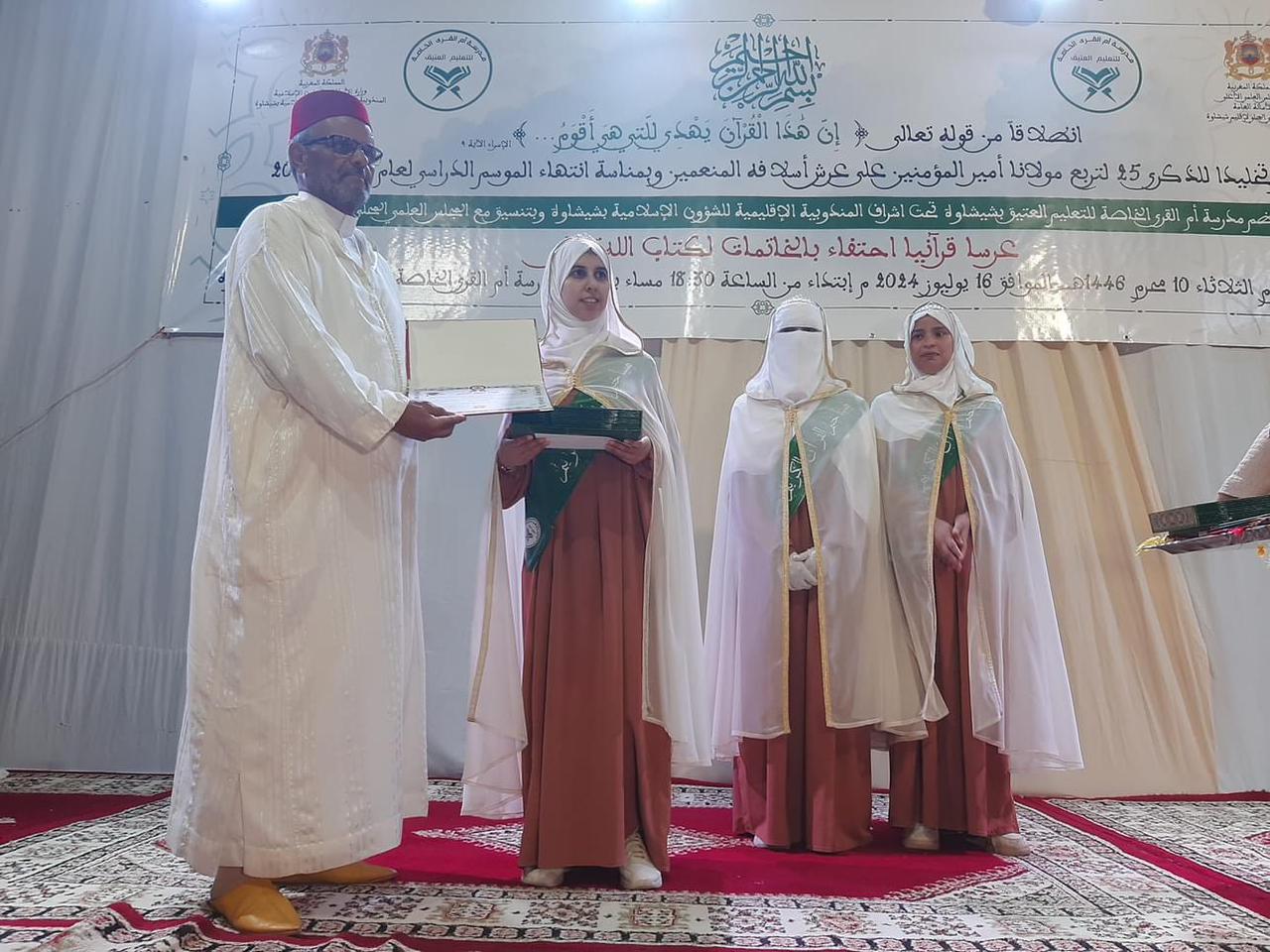 تخليدا للذكرى 25 لتربع جلالة الملك محمد السادس نصره الله على عرش أسلافه الميامين, وبمناسبة إنتهاء الموسم الدراسي لعام 2023/2024، نظمت مدرسة أم القرى الخاصة للتعليم العتيق بمدينة شيشاوة يومه الثلاثاء 10 محرم 1446 ه يوم عاشوراء الموافق ل 16 يوليوز الجاري حفلا تكريميا لفائدة 30 من خاتمات القرآن الكريم، انطلاقا من قوله تعالى( إن هذا القرآن يهدي للتي هي أقوم).