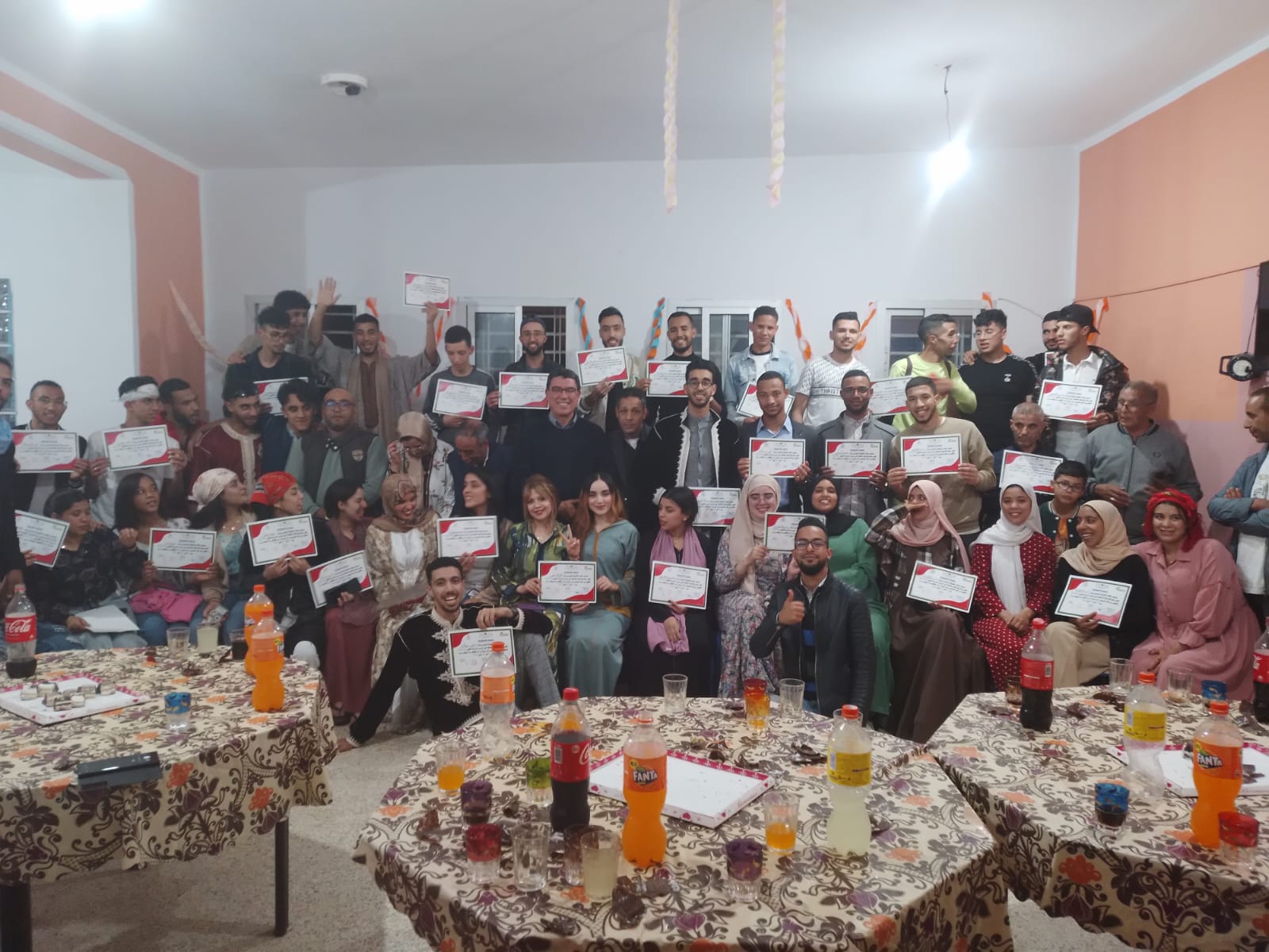 ونظمت الجمعية اليوم السهرة الختامية بمشاركة كل الأطر والمستفيدين ،من خلال تقديم لوحات فنية موسيقية رائعة،استحسنها الحضور،الذي تابع أيضا فقرة التتويج وتوزيع الشواهد على المشاركات والمشاركين، الذين حملوا معهم معارف وطرق ومعلومات،أكيد ستحفزهم على المزيد من العطاء والاجتهاد لربح تكوين الدرجة الثانية والثالثة في التدريب.