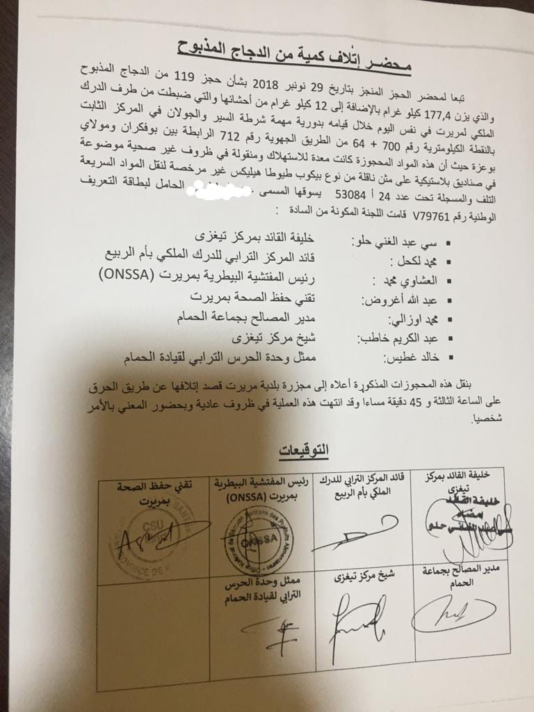 و تمكنت الجريدة من الحصول على وثيقة حصرية تأكد تفاصيل القضية حيث جاء في المحضر المنجز في نفس اليوم 29 نونبر 2018 تم حجز 119 من الدجاج المذبوح يبلغ وزنه 177،4 كيلو غرام بالإضافة إلى 12كيلو غرام من أحشائه وضبطت من طرف الدرك الملكي لمريرت بالنقطة الكيلومترية رقم 700+64 من الطريق الجهوية رقم 712 الرابطة بين بوفكران و مولاي بوعزة حيث أكد المحضر أن المواد المعدة للاستهلاك منقولة في ظروف غير صحية موضوعة في صناديق بلاستيكية في عربة من نوع بيكوب غير مجهزة بآلات التبريد ووقع على المحضر عدد من المسؤولين و تم حرق المواد المحجوزة بالمحجز البلدي لمدينة مريرت.