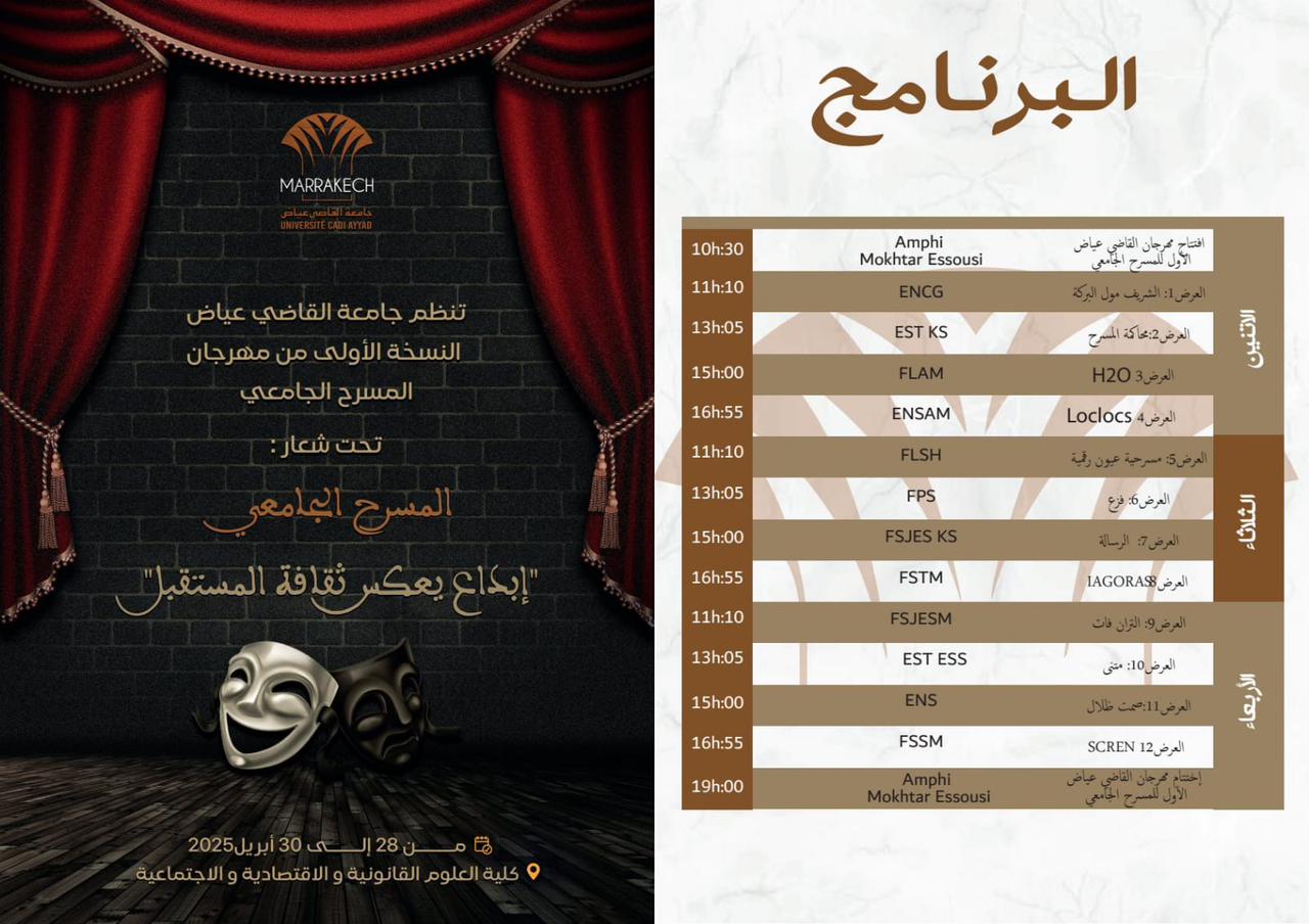 “المسرح الجامعي: إبداع يعكس ثقافة المستقبل”، وذلك خلال الفترة الممتدة من 28 إلى 30 أبريل 2025 بكلية العلوم القانونية والاقتصادية والاجتماعية بمراكش.